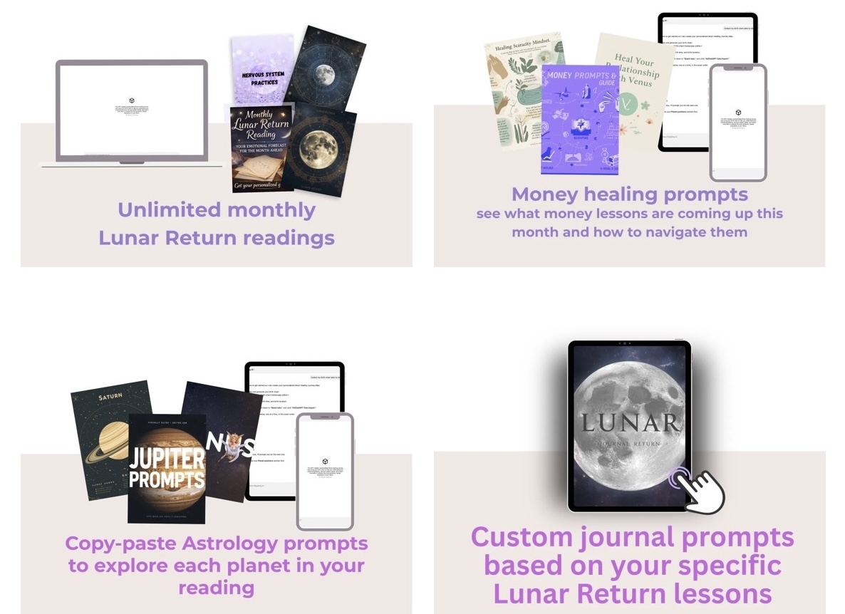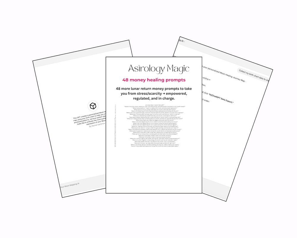 Most people recognize money patterns after they’ve already played out. This bonus gives you 48 tested prompts to spot what’s activating around money in your Lunar Return before you repeat the cycle—so when real-life decisions come up, you respond with clarity and feel steady instead of powerless.